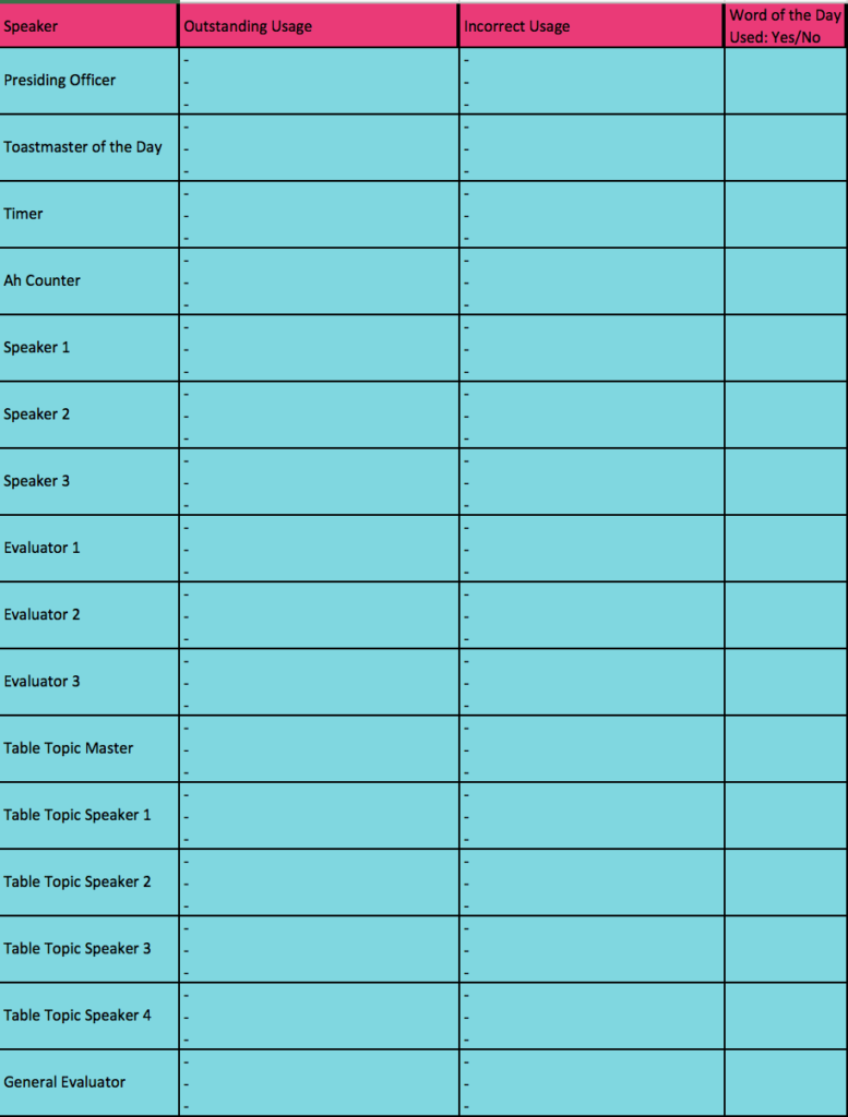 You can download this template here to take to your next Toastmasters meeting and use it to create your Grammarian report!