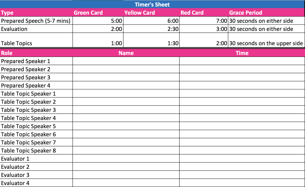 As the Timer, you might also be required to state the timings for the Table Topics and the Evaluations.